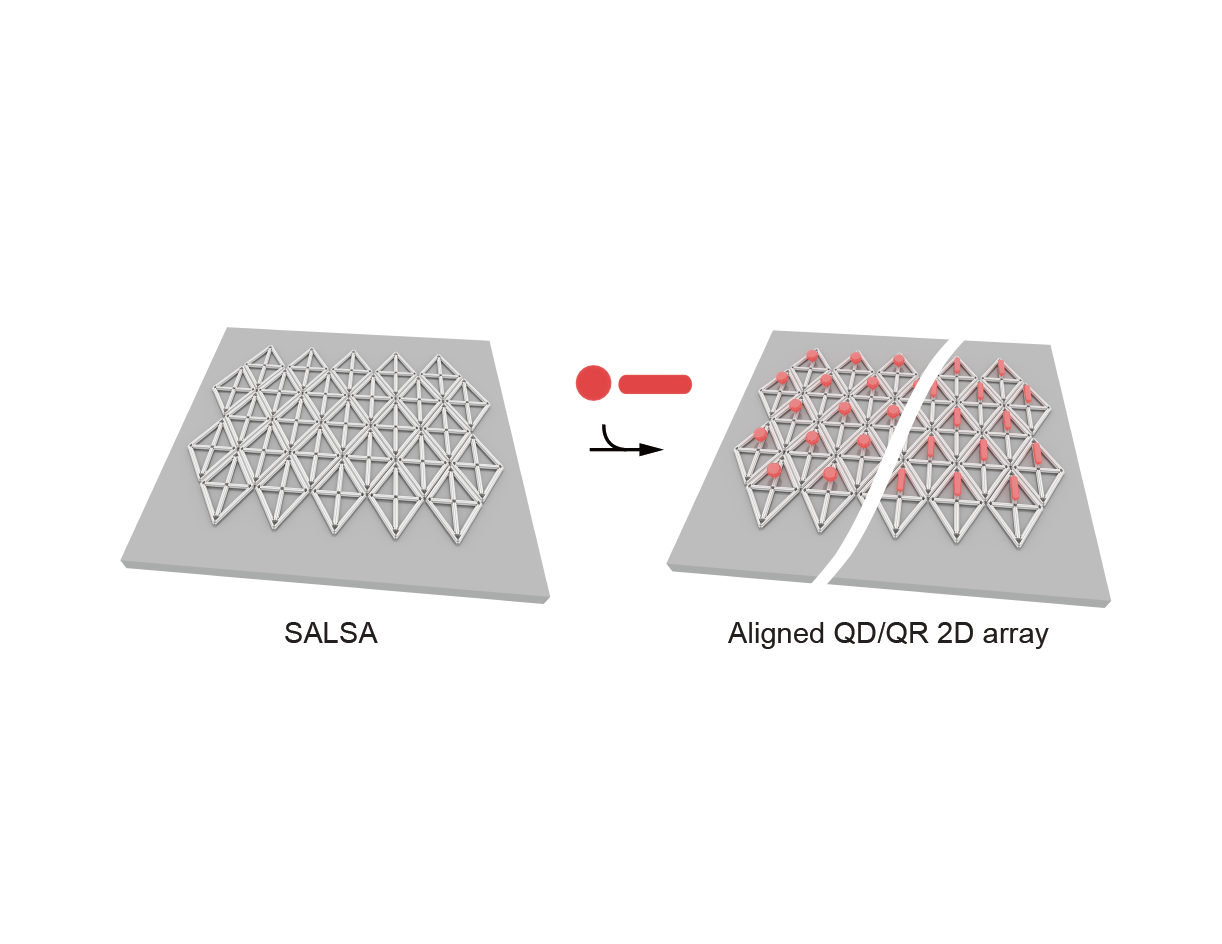 The SALSA strategy enables the direct fabrication of DNA origami lattices on solid substrates with precise control over the relative orientation of individual origami tiles. The key to achieving such orientational control within two-dimensional lattices lies in the introduction of anisotropic lateral interactions between neighboring origami units. In addition, an entropy-driven brush design is implemented to guide the preferential landing orientation of each origami monomer, ensuring that all tiles adhere to the substrate with the same face up, thereby facilitating the assembly of larger, well-ordered superstructures.