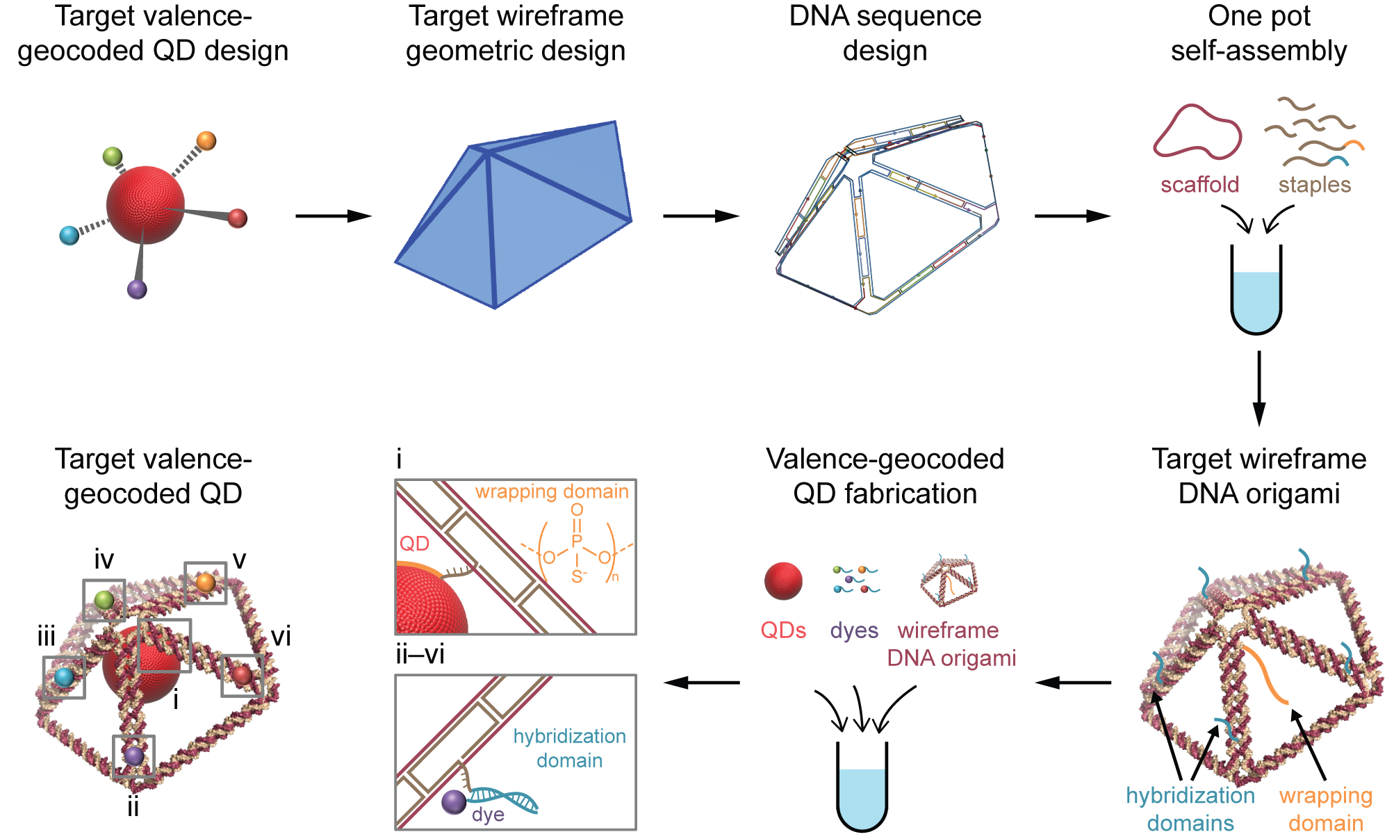Valence geocoding represents a potent and adaptable design strategy that facilitates nanoscale three-dimensional spatial addressing and valence manipulation of quantum dots. Furthermore, this approach allows for the creation of high-precision optical nanodevices, including colloidal molecules and three-dimensional energy transfer circuits, by harnessing the remarkable programmability of three-dimensional wireframe DNA origami.