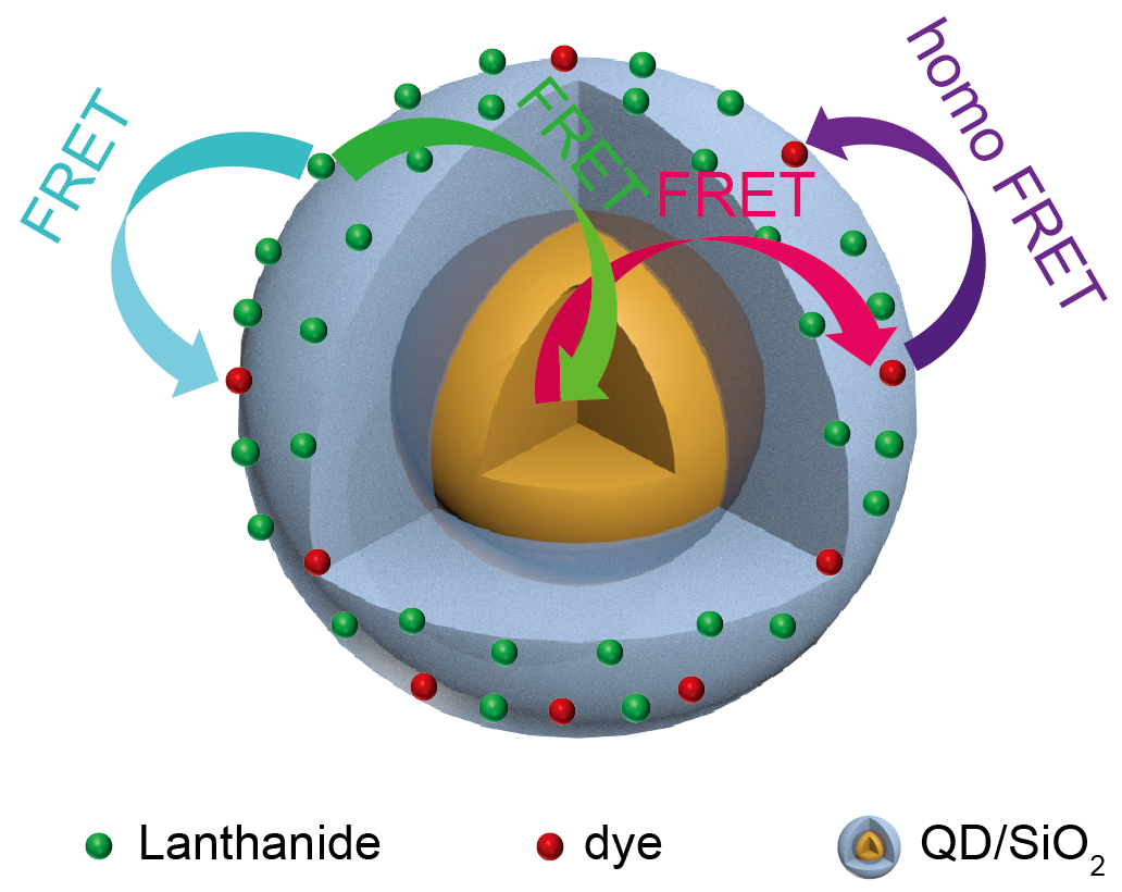 Through comprehensive characterization of the Ln-QD-dye FRET system under a diverse range of configurations using steady-state and time-resolved spectroscopy and Monte Carlo simulations, we have achieved a profound comprehension of these multifaceted FRET nanosystems. This knowledge has enabled us to meticulously adjust the ingoing and outgoing FRET contributions, ultimately providing ultimate control over photoluminescence intensities and lifetimes. This methodology has allowed us to engineer hybrid nanoparticles with distinct photoluminescence lifetimes for optical RGB barcoding, while maintaining similar photoluminescence brightness and utilizing only a single excitation and emission wavelength.