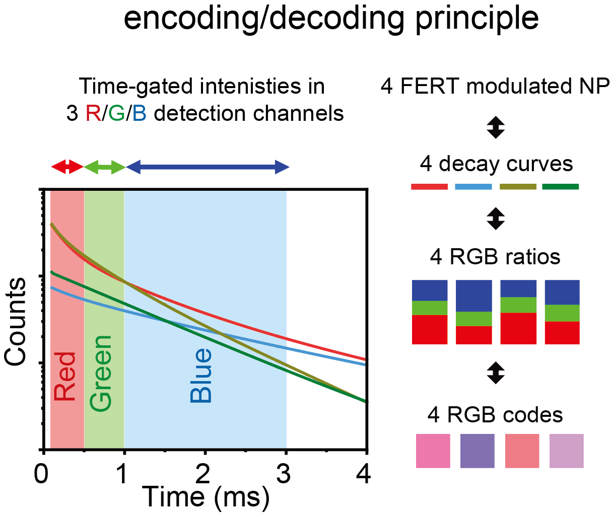 Based on the intersections of the four distinct photoluminescence decay curves, we have selected and defined three temporally distinct time-gated photoluminescence intensity detection windows as red (R), green (G), and blue (B), respectively. A single photoluminescence intensity, integrated over the time interval of the detection channel, is recorded for each channel. The diverse shapes of the decay curves (i.e., varying photoluminescence lifetimes) give rise to unique combinations of photoluminescence intensities across the three detection channels R, G, and B. Consequently, each FRET nanoparticle can be identified by its distinctive RGB ratio, which is the ratio of the time-gated photoluminescence intensities (R/(R + G + B), G/(R + G + B), and B/(R + G + B)).